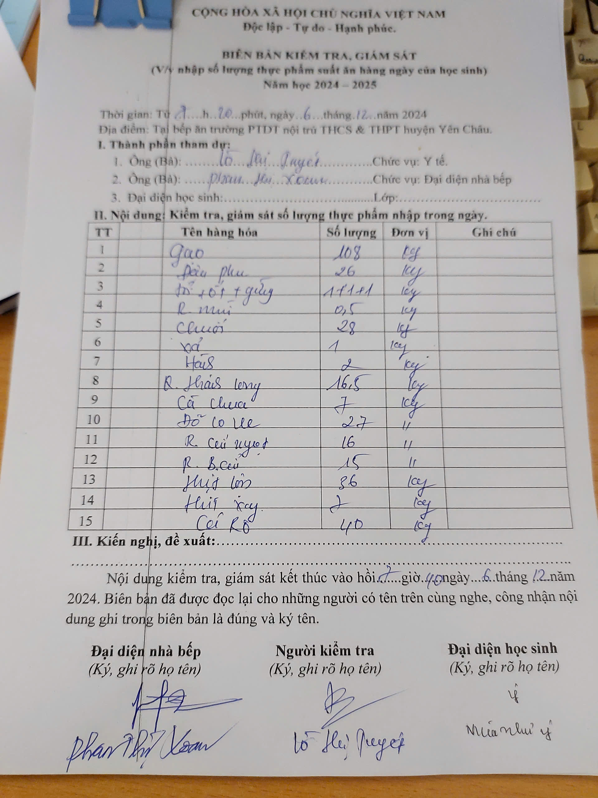 Biên bản nghiệm thu bữa ăn ngày 06/12